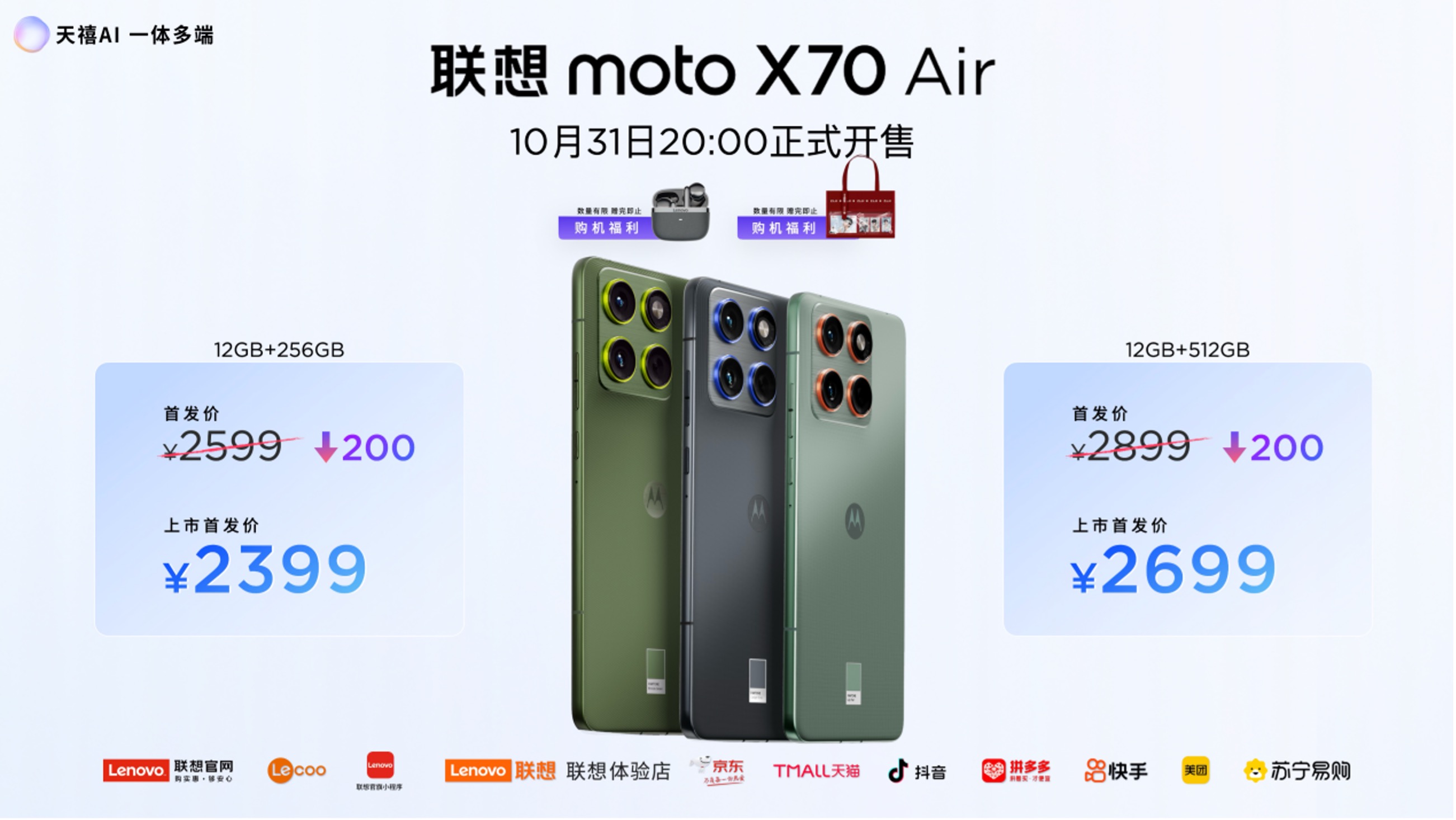 价格方面,联想moto X70 Air售价2599元起,10月31日晚8时全渠道正式开售,首销福利限时优惠仅2399元起,还可享国补和平台补贴等多重优惠。